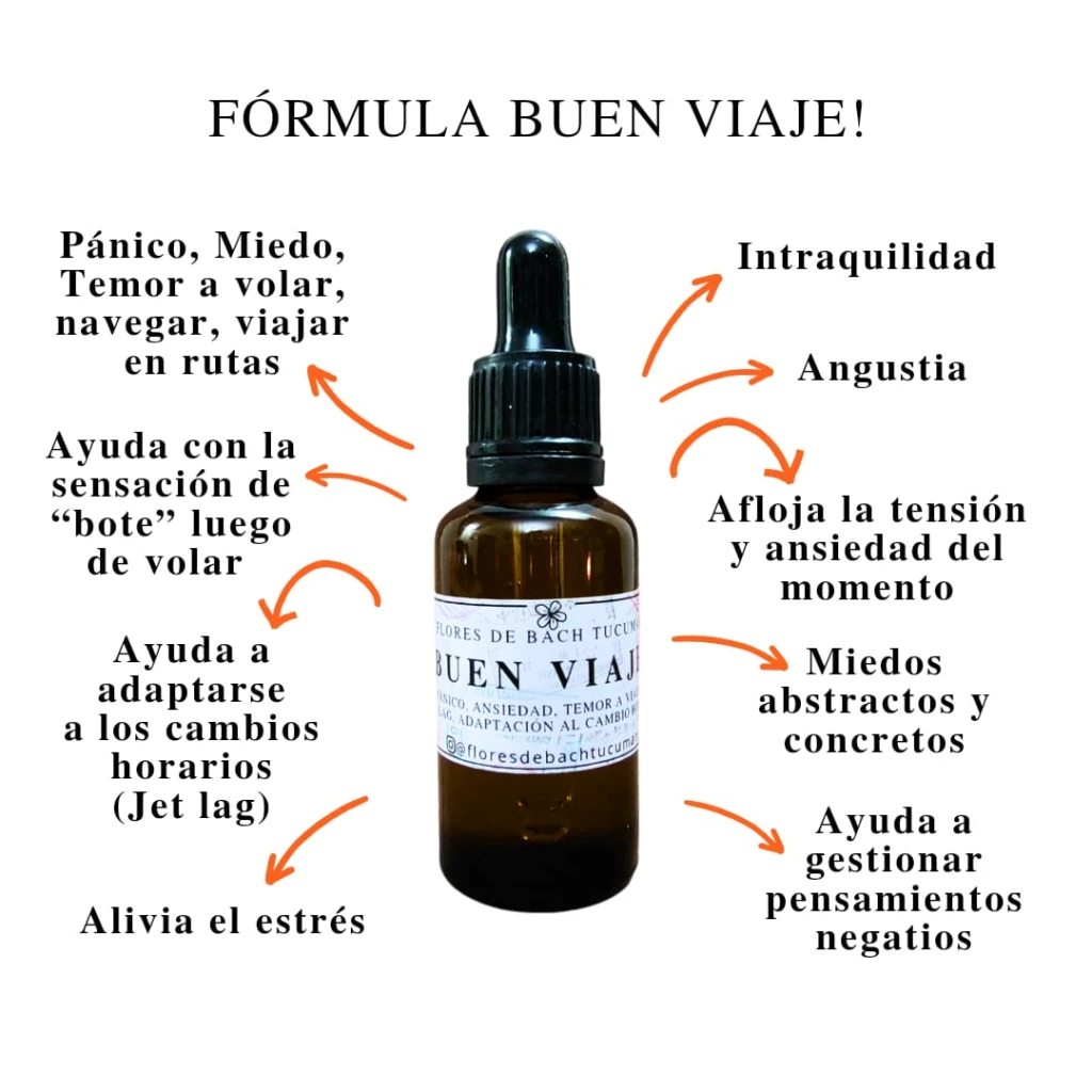 Esta fórmula está creada para acompañarte tanto en los momentos previos, durante y cuando llegas a destino de un viaje, a poder sobrellevar el pánico, miedo o temor a volar, navegar, andar en rutas. Asimismo con la sensación de angustia, pensamientos negativos, miedos abstractos y concretos, aflojando la ansiedad y el estrés del momento, para finalmente ayudarnos a adaptarnos a los cambios horarios (jetlag), y con la sensación de "bote" luego de tener un viaje aereo.