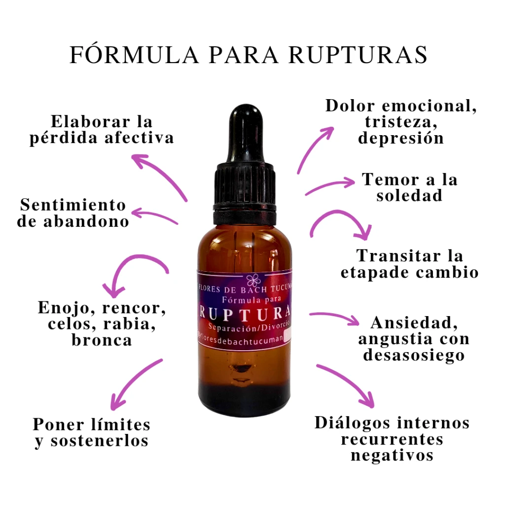 Esta fórmula está diseñada para ayudarte afrontar y atravesar una situación de separación o divorcio, ayudándote a poder elaborar la pérdida afectiva, sentimiento de abandono, miedo a la soledad, ansiedad, angustia con desasosiego, desesperación, si hubo componentes traumáticos, rumeación mental, tristeza, rabia, bronca, celos, enojo, dolor emocional, poder poder límites y sostenerlos, transitar la etapa de cambio.